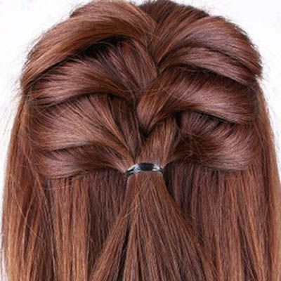 第二步把左侧的头发也进行统一的扭转,之后把两支扭转好的发辫用橡皮筋固定,并用发卡将发尾向上固定住。