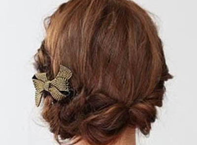 第三步将上面的头发放下来,往旁边扭转然后遮盖住上面的发尾,再用精美的发卡固定好。