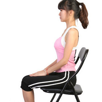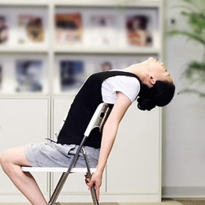 抬起一只腿,放到椅子上,并且尽量靠近大腿。伸直背肌,两手在胸前合掌。吐气,上半身往抬腿的那一边扭转,90度角的幅度为准。