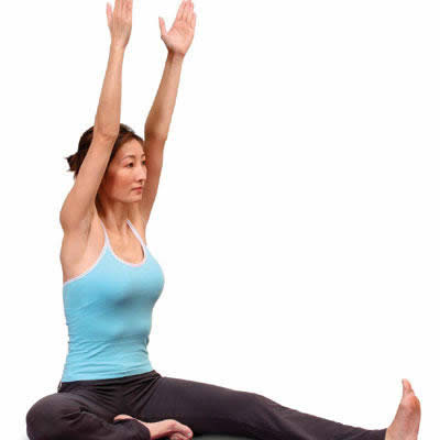 2、双手向上伸直,双肩下沉,将上身微微向前,然后向右伸展,保持1分钟。