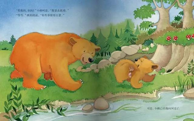 “不错啊!”熊妈妈笑着说,“但是,你现在你要看我是怎么做的,你要先学会游泳,再去抓鱼。”