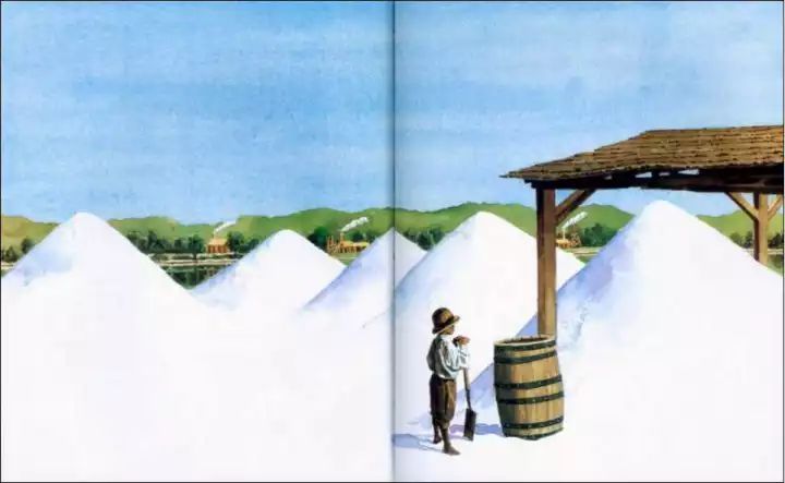 我们只有在的时候才休息一会儿——土豆和玉米饼是爸爸放在他的外衣口袋里带带来的。我一边吃饭,一边看着这些白色的盐山。盐巴很重,也很粗糙。一不小心这些闪亮的魄晶体就会割破你的手、胳膊、腿和脚掌。