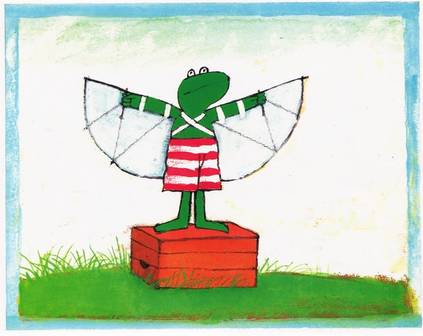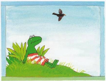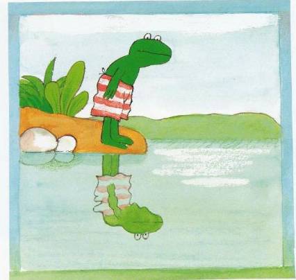 弗洛格很沮丧,觉得自己什么都不会,只是一只普通的青蛙而已。野兔安慰弗洛格,我们爱你只是因为你是一只青蛙,一只穿着条纹泳裤的绿色青蛙,想通了这一点,弗洛格又觉得很开心了,他快乐地大跳,感觉自己好像在飞呢。